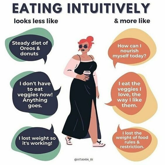 Intuitive eating (a 10-minute article) is a non-diet approach to eating by relying on hunger cues to meet your needs. Intuitive eating focuses on how food nurtures your body, and it helps develop a more positive relationship with food.